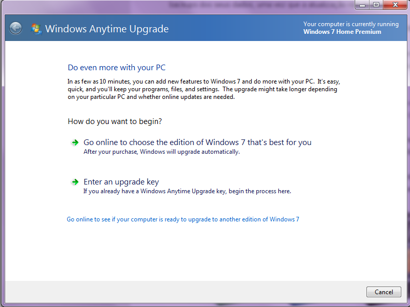 Este upgrade pode ser feito de 2 formas diferentes, através do disco da versão mais avançada e respetiva chave de produto, e através do Windows Anytime Upgrade.