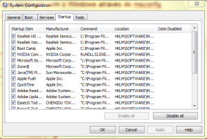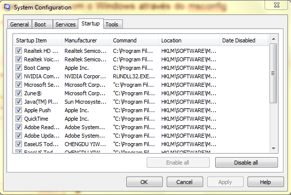 Aí podemos ver a lista das aplicações que arrancam com o Windows, se quisermos que alguma não arranque, é só desmarcar a “checkbox” correspondente à mesma (o quadradinho à esquerda da aplicação).