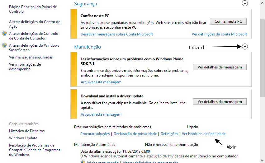 3) Poderá depois abrir a aplicação clicando em “Ver histórico de fiabilidade” (View Reliability History), que pode ser encontrado após expandir a área manutenção: