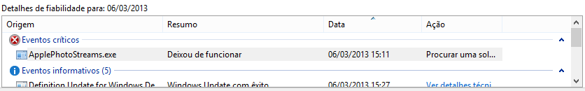 Clicando numa coluna de um determinado dia, poderá ver depois em baixo (espaço detalhes de fiabilidade ou Reliability Details), os eventos que realmente aconteceram: