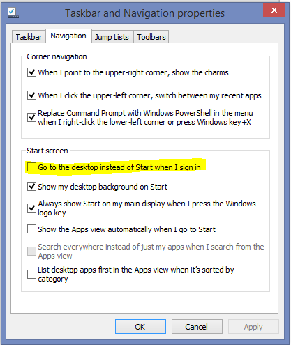 No Windows 8.1 esse problema está resolvido e passa a ser possível arrancar para o ambiente de trabalho tal como acontecia até ao Windows 7, bastando para isso ir às propriedades da barra de tarefas (clique com o botão direito do rato sobre esta -> Propriedades (ou properties) e ativar a seguinte opção: