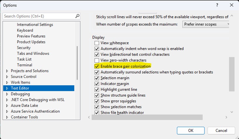 Uma funcionalidade bastante interessante do Visual Studio e que pode ser útil quando trabalhamos em projetos legacy com classes gigantescas é a “Enable brace pair colorization”: